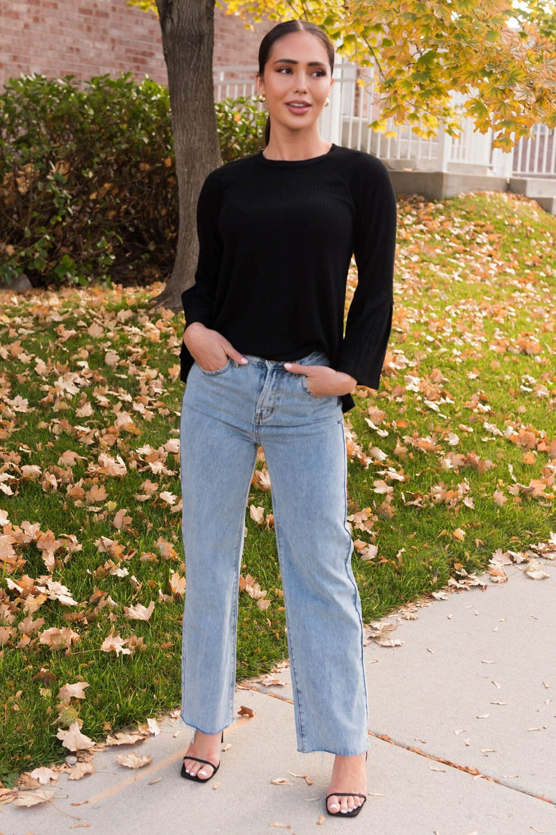 This lovely ribbed blouse stole our hearts the moment we saw it! We are loving the soft round neckline, feminine long bell sleeves and perfect length. This top will always be a hit! Get yours today!