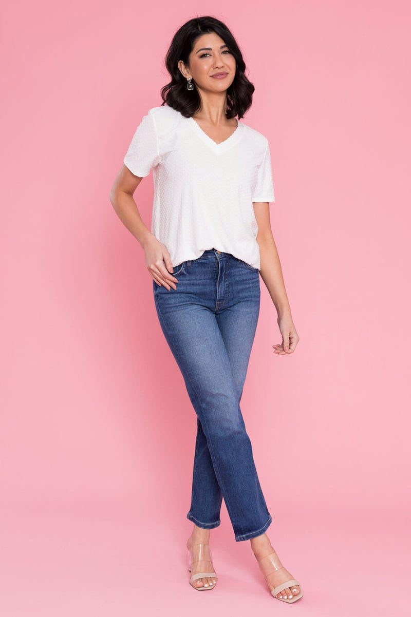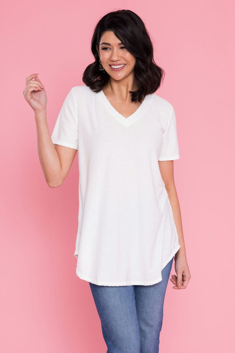 The most darling swiss dot top is here and needs to be a part of your wardrobe! Featuring the perfect flowy fit, modest v-neckline, & short sleeves Get yours today before it's gone and you regret it!