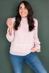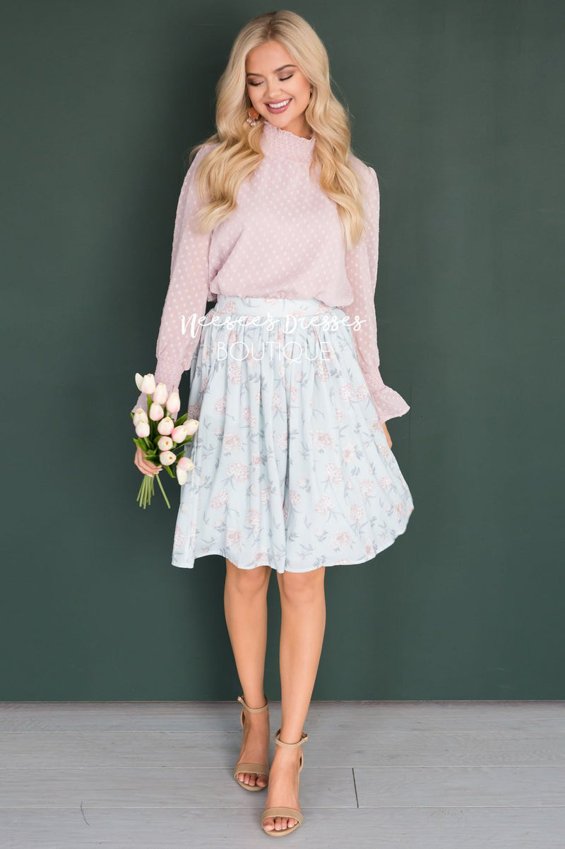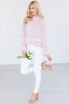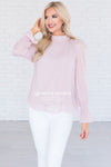 This delicate blush blouse is perfect for Spring and Summer days! Featuring a textured swiss dot print that creates the softest feminine touch! This gorgeous top also features an ever charming shirred round neckline, full length cuffed puff sleeves, and is lined everywhere except the sleeves.