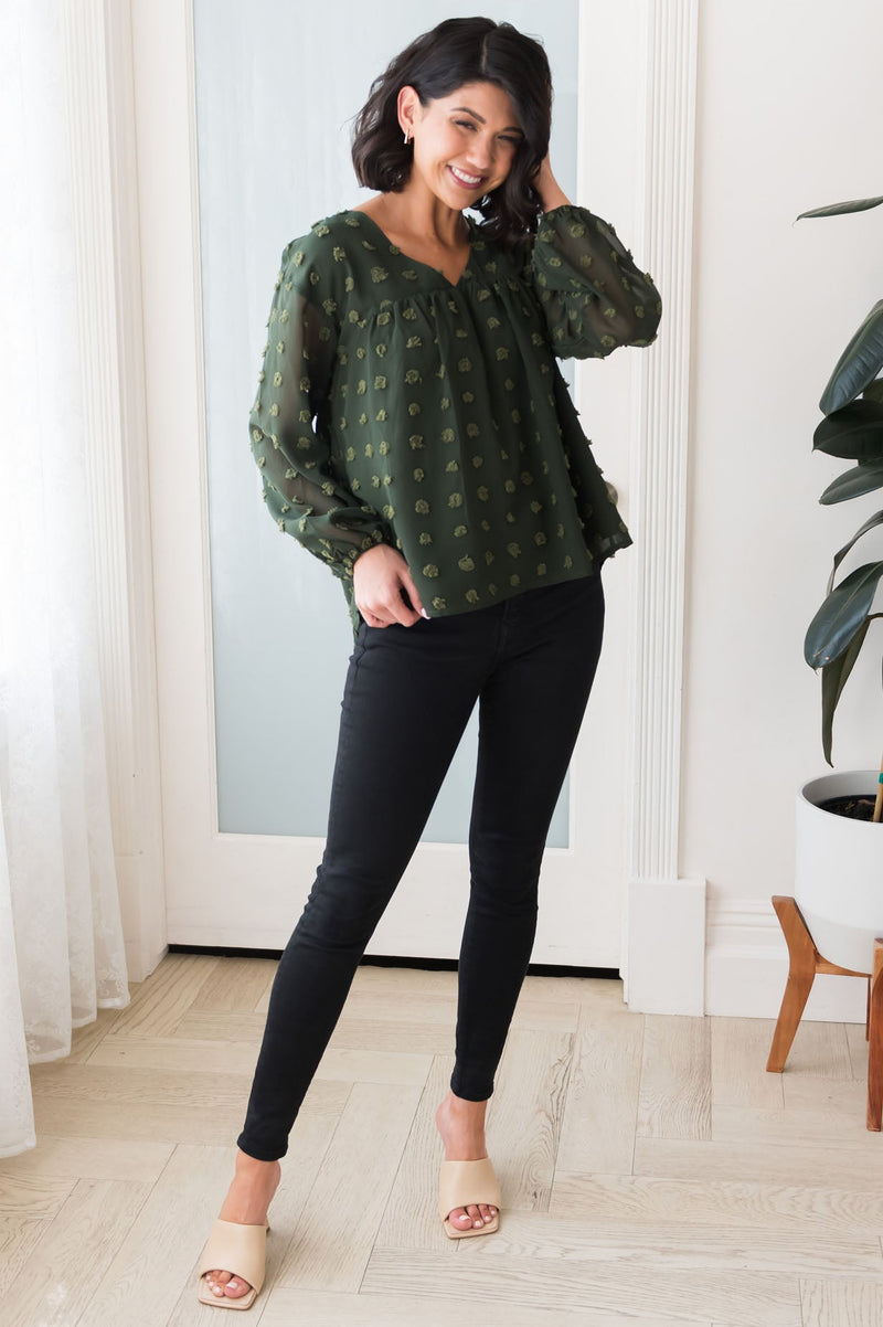 We are obsessed with this swiss dot beauty! The Adored Always blouse has every delicate feminine feature we could think of! The lovely rich burnt olive color compliments the long unlined sleeves and gorgeous high/low hemline so well. Pair this with our favorite jeans or skirt and you have the perfect outfit!
