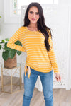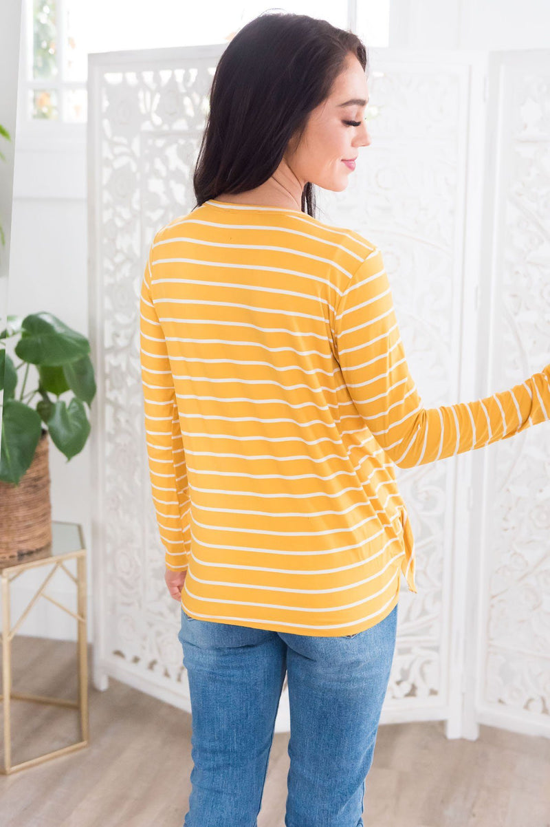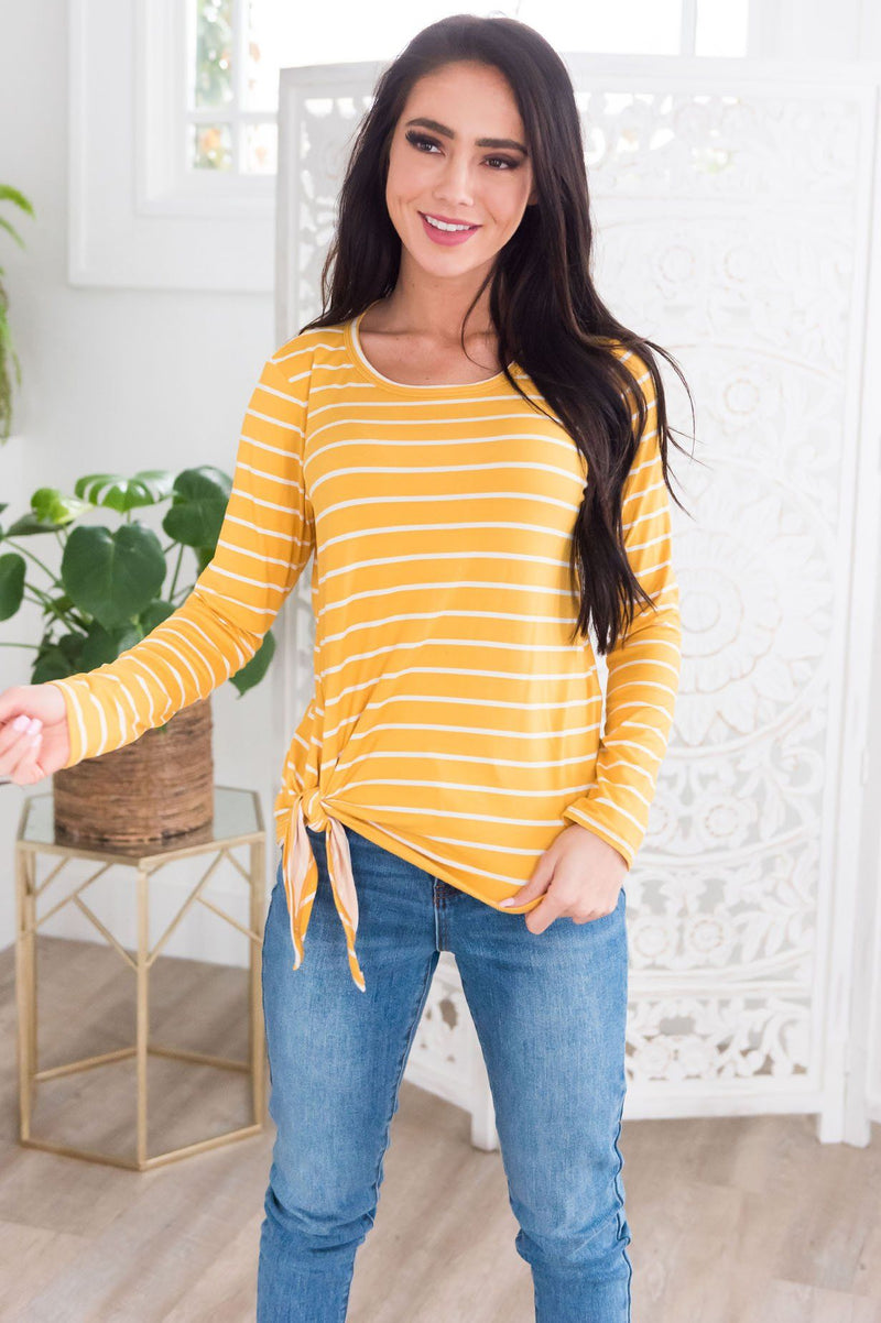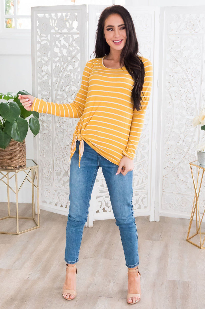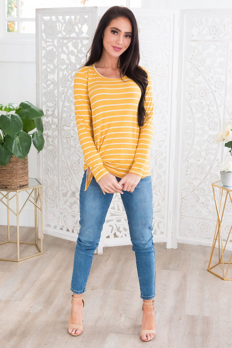 The new Adventure Filled Day Modest top is bound to assist in giving you an adventure indeed! This darling feminine top features our ever popular mustard & ivory stripes, long fitted sleeves and the most delicate side tie knot detail. Get yours today!