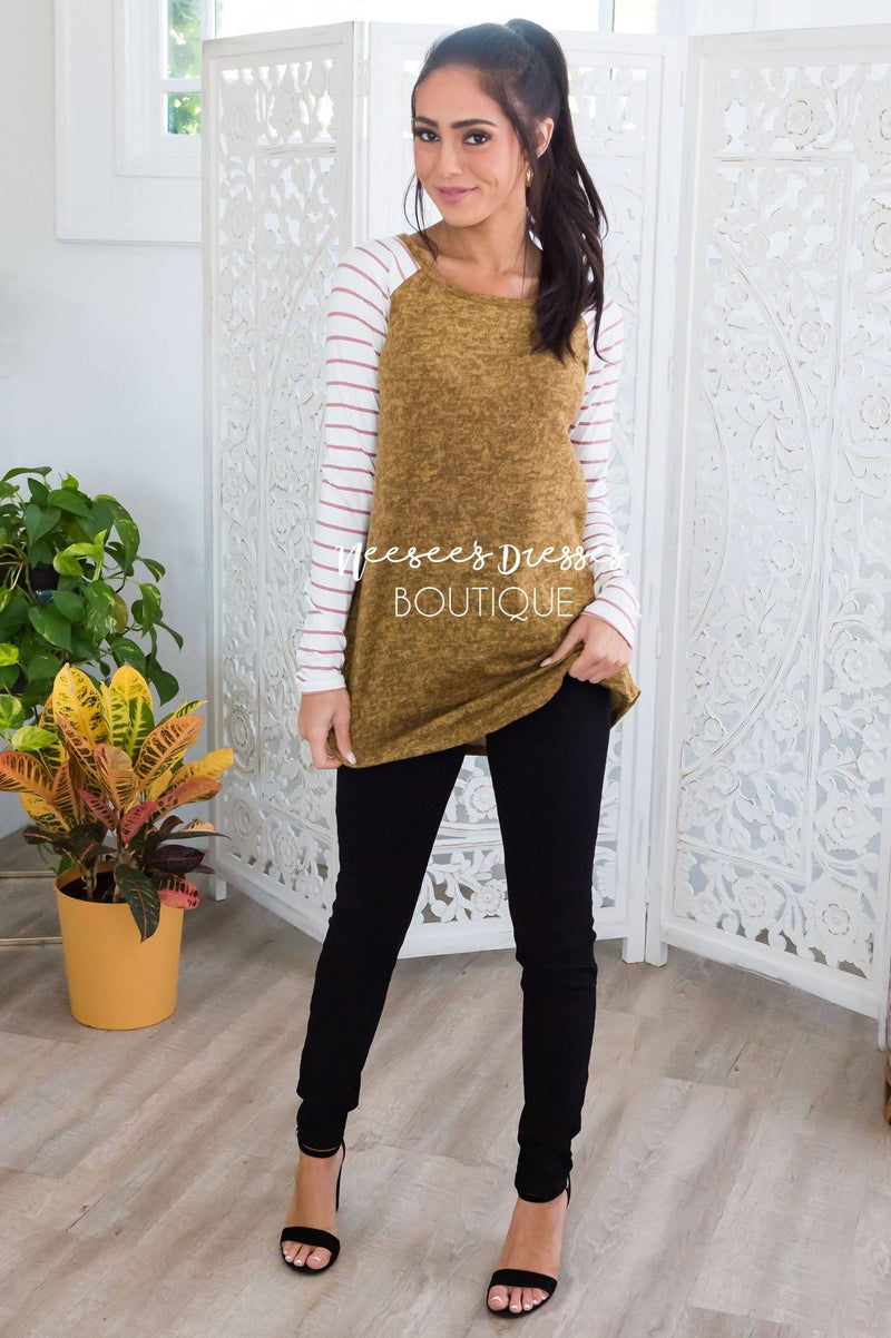 Are you ready for the perfect super soft baseball tee style top?! This top will definitely keep you feeling cozy while looking stylish! Featuring modest round neckline, 3/4 length striped sleeves and the perfectly soft heather mustard material. This one is surely a must have!