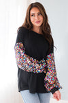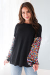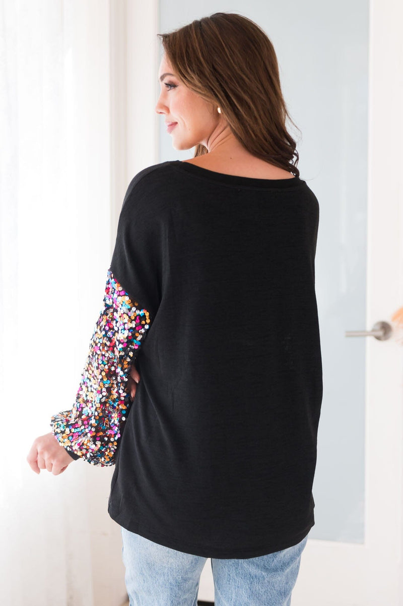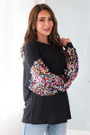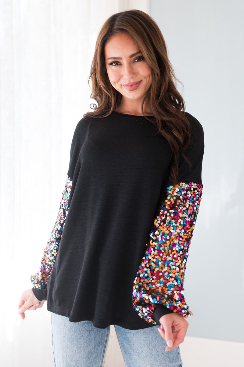 This beautiful new sweater has arrived at just the perfect time for the holiday season! With features like the stunning colorful bishop style confetti sequin sleeves and the contrasting bold black body, it's the perfect pop of color to bring in the holiday season!Details: