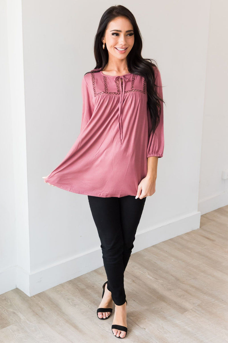 We couldn't wait to bring you the cutest & coziest modest tops! The Always On My Mind layering top definitely fills that role! Featuring a lovely deep mauve, 3/4 length sleeves and the completely on crochet lace detailing and neck tie. *This top is meant to be worn with an undershirt, try it with one of our cap sleeve layering tee's!