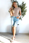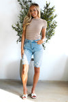 These high rise bermuda shorts will have you wishing warm weather was endless! We are loving the light indigo color these come in. They also feature cute front pockets and perfect length worn-torn hem! These shorts are going to be your new go to on those sunny days!