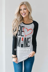 Shop our collection of the cutest Valentines Day tops! "Be Mine" gray top with black sleeves and lipstick and heart print.