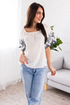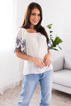 The perfect blouse does exist! This flowy elastic neckline top with the most darling navy embroidery, it's the perfect go to piece! Grab this top today to start pairing it with all of your favorite jeans and skirts!
