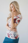 This is the perfect go-to top, and believe us when we say, this top is incredibly soft! Beige top features a round neckline, half sleeves and a maroon floral print. Perfect for pairing with all of our skirts.