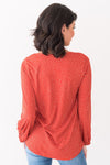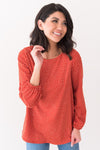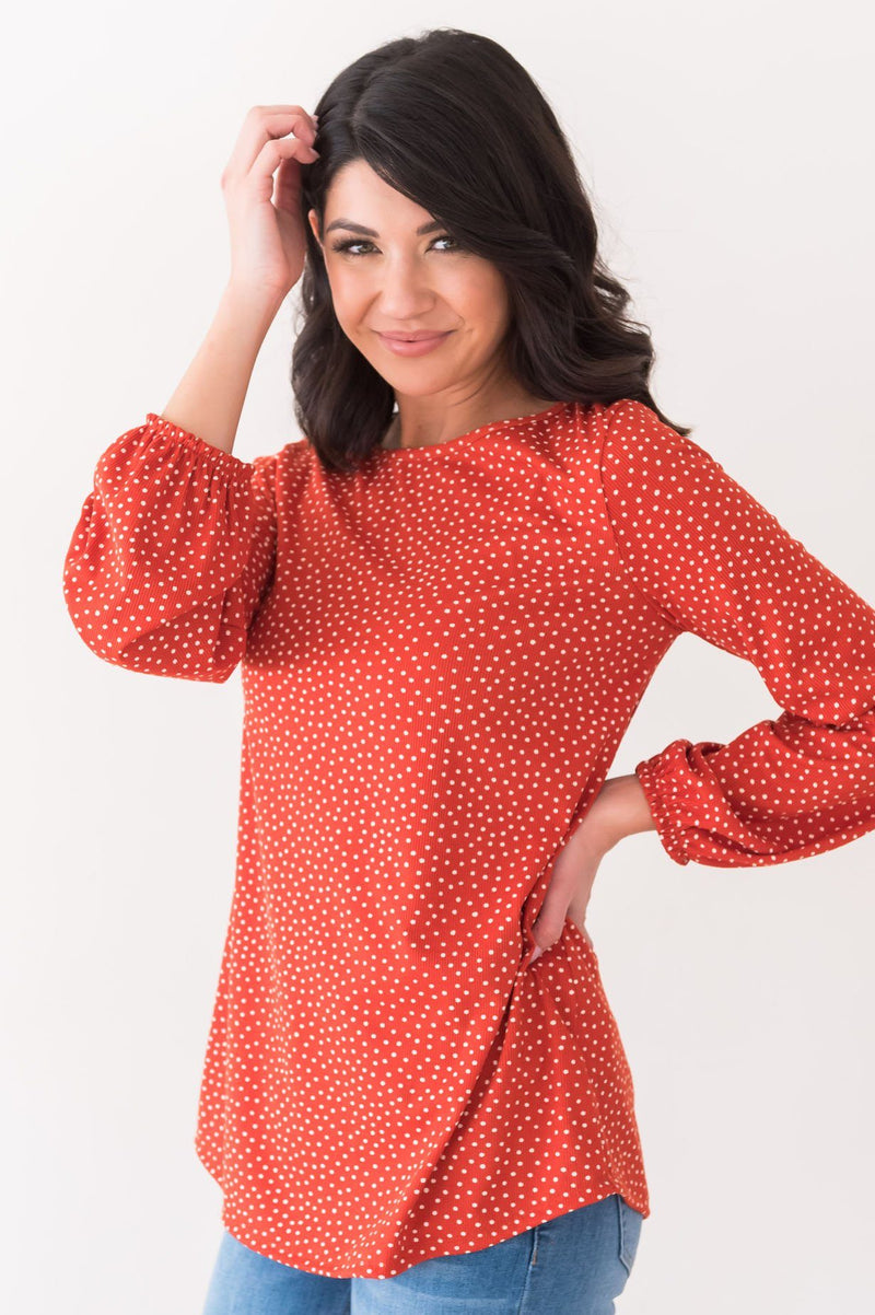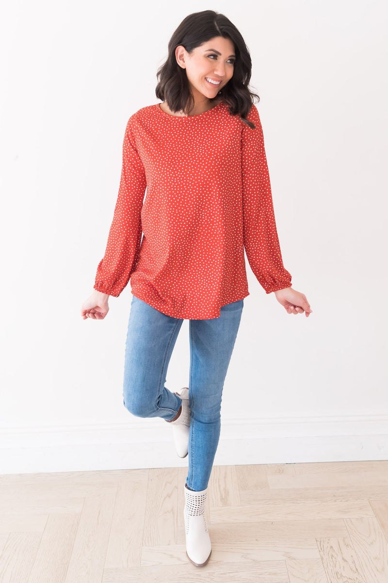 This delicate polka dot blouse checks all the marks! We love the long sleeves, beautiful brick red color, pretty ivory polka dots throughout, and the rounded neckline is absolutely radiant! The straight fit of this blouse makes it perfect for tucking in a skirt or leaving tucked out for jeans! This will be your new favorite blouse this season!