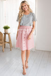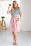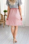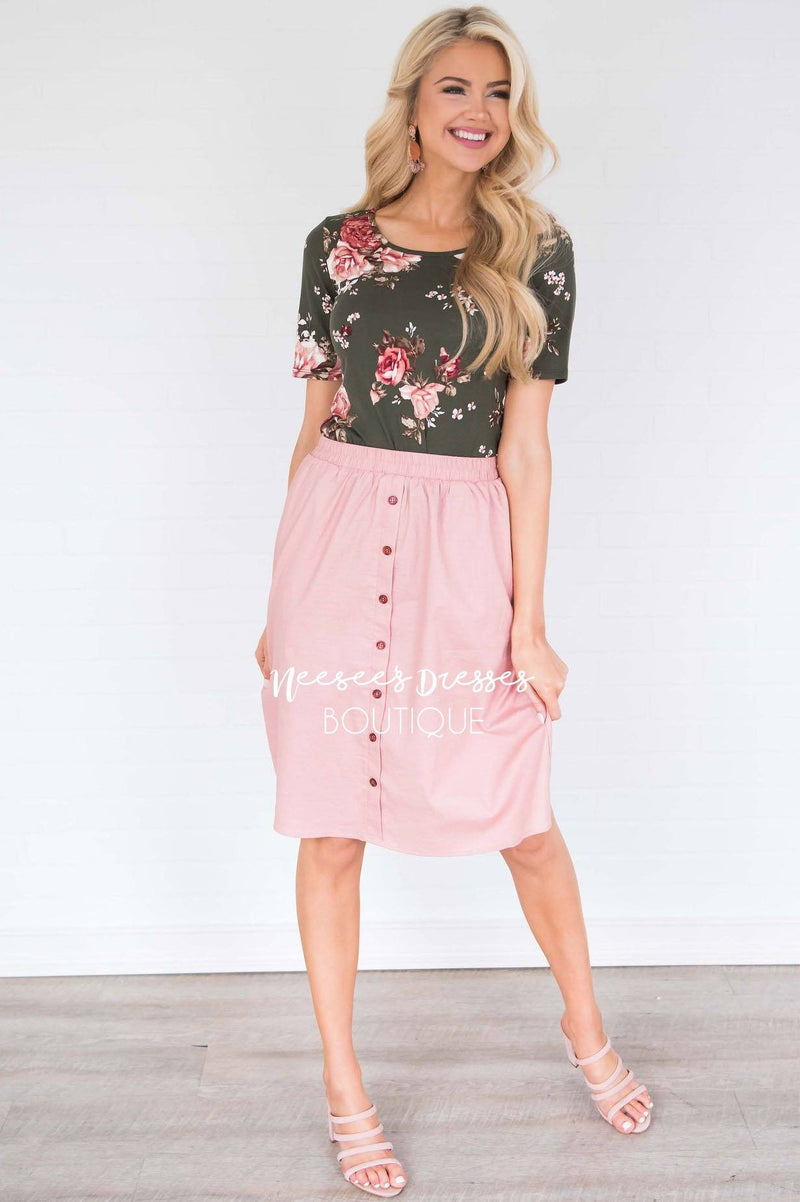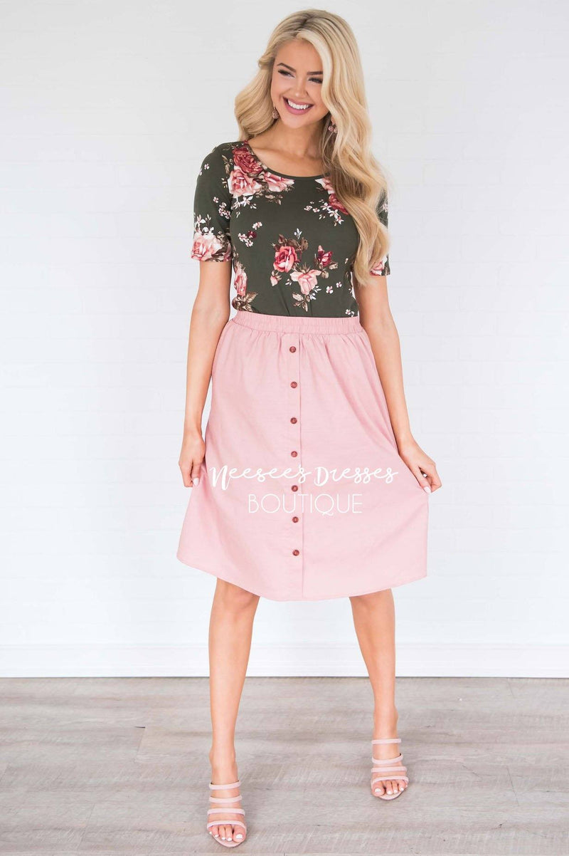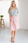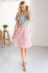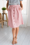 Don't blink or this beautiful skirt will be gone! Beautiful pink a-line skirt features an elastic waist band and button details down the front.