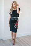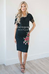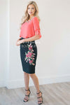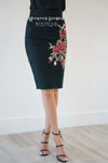 We absolutely adore this new pencil fit skirt! This slip on, stretchy, little black skirt features a comfortable wide elastic waist and gorgeous rose embroidery detail.
