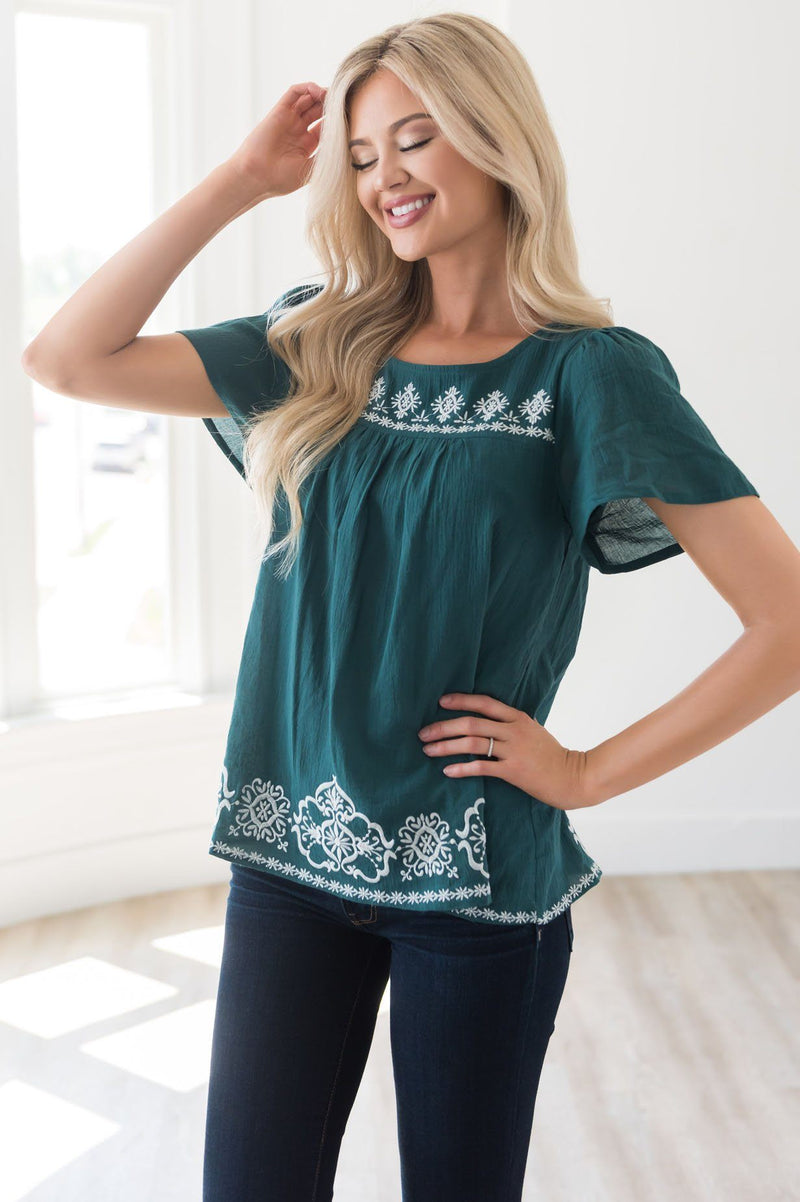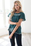This detailed and trendy top is going to be a fan favorite this summer season! We know the delicate ivory embroidery on the dark teal linen material is beautiful! The short flutter sleeve and bell shape design is flattering and trendy!