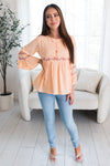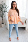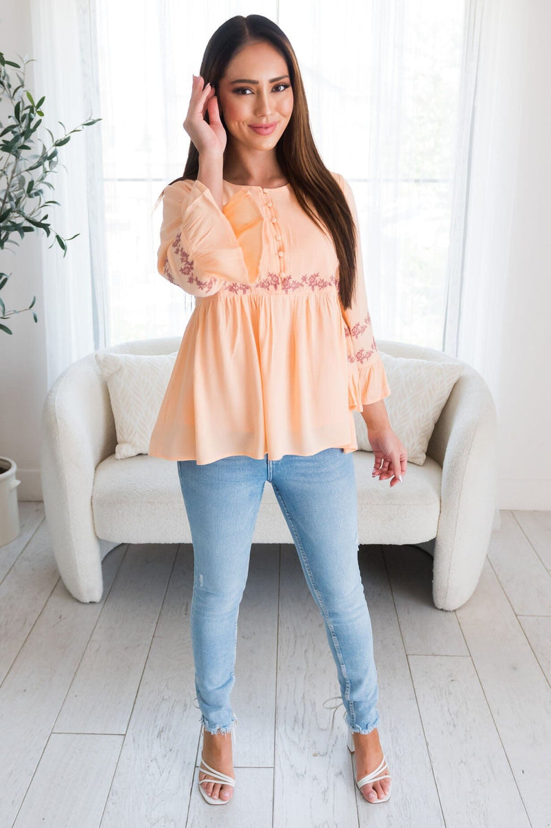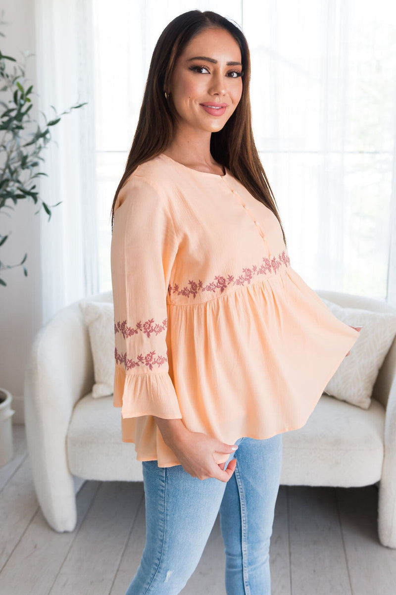 We are turning heads this spring in this stunning new blouse! Featuring the perfect combination of bright coral with mauve embroidered details, this blouse is absolute perfection! Featuring a flowy flounce sleeve, a rounded neck line with a button down front and a baby doll waist line. This blouse is also lined.