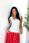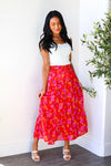 This darling floral skirt is going to be your new go to! We love the cozy elastic waistline with classy faux front buttons, gorgeous dusty red colorful floral, pockets and perfect length tiered skirt. Get yours today!