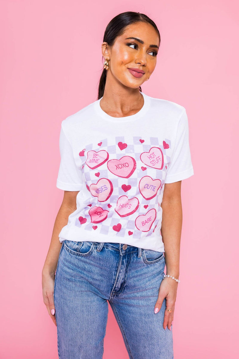 We've got your new favorite tee! Featuring unbelievably soft material, the Candy Hearts Valentine graphic and short sleeves. This is your new modest feminine t-shirt go to! Get yours today!