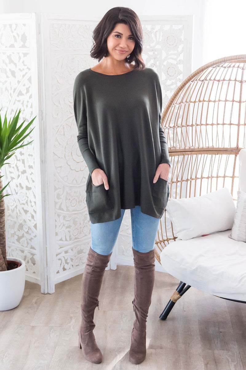 Say hello to your new favorite fall sweater?! Whether you're going out with your friends or simply wanting a cozy sweater to relax at home in, this super soft sweater checks all the boxes! Featuring long sleeves, a rounded neckline, a beautiful hunter green color, two pockets on the front of the bodice, and a relaxed oversized fit! We do not want you to miss out so hurry and get yours soon!