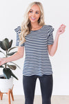 You can never go wrong with stripes! We are keeping it casual and cute this spring in this new top! Navy and ivory striped top features a rounded neck line, half length sleeves plus a ruffle shoulder detail.