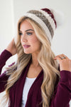 Spice up all your fall outfits with our new Chase My Heart beanie! Burgundy, ivory and mocha mohair striped beanie features a cable knit fabric with an ivory fur pom!