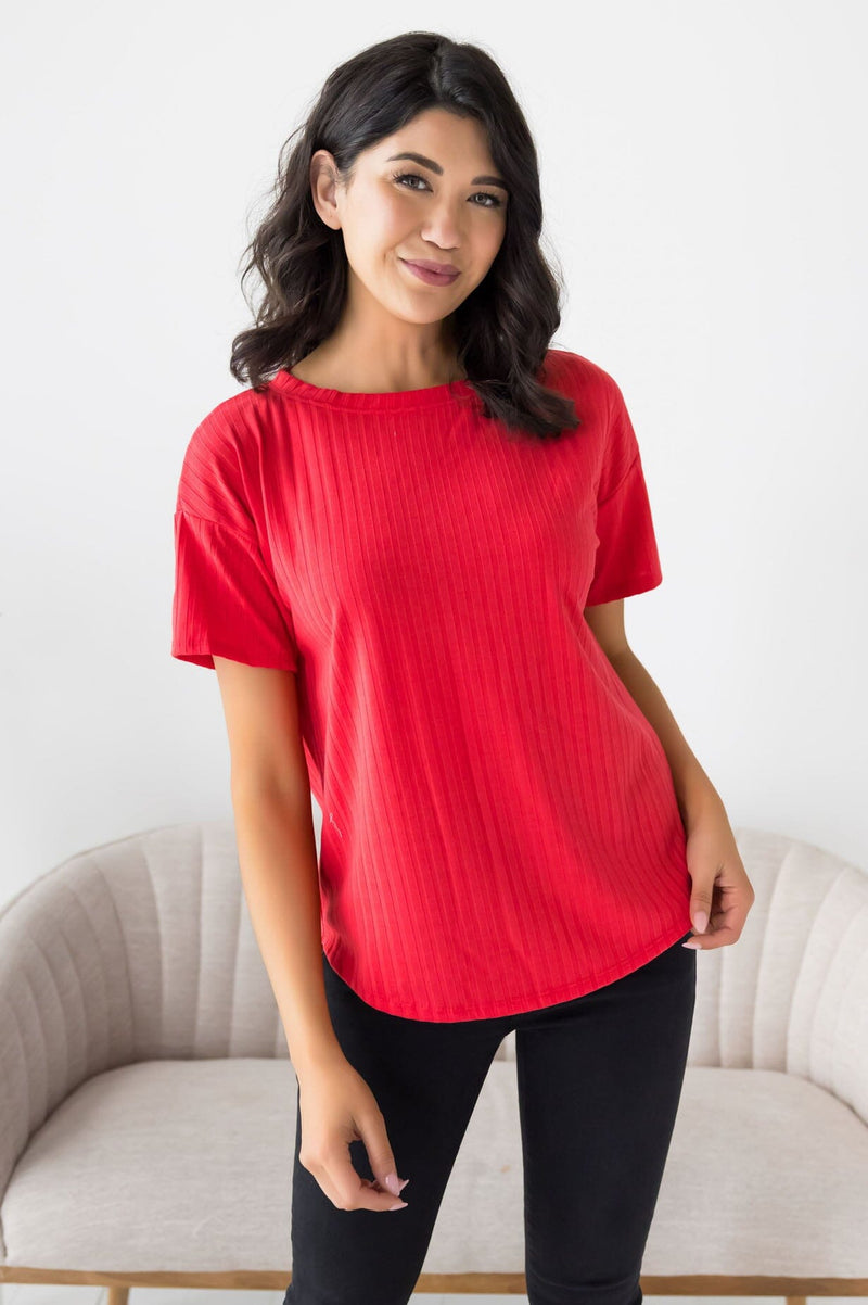 To say we are in love with this top would be an understatement! This gorgeous vibrant color is seriously a must! It features a round neckline, short sleeves and softest ribbed material EVER. Trust us ladies, add to cart now!
