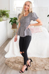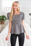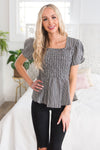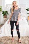 This gorgeous gingham blouse will bring a little feminine touch to any outfit! If you've been on the search for the perfect blouse to add to your wardrobe, look no further! Features include lovely soft square neckline, short puff sleeves and our favorite flowy peplum style.