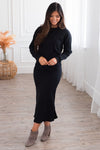 This darling ribbed sweater skirt is perfect for Fall! Featuring a classic black color, it creates the softest feminine touch and pairs well with everything! Get yours today and be sure to grab the Classy And Cozy Modest Sweater for the perfect mix and match outfit!