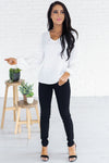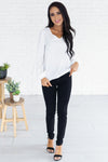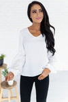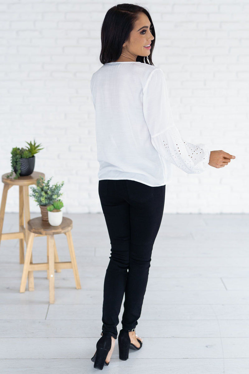 This delicate blouse is perfect day or night! Featuring gorgeous flowy fabric and lovely eyelet sleeves, it creates the softest feminine touch! White Blouse features a soft v-neckline & puff eyelet sleeves.