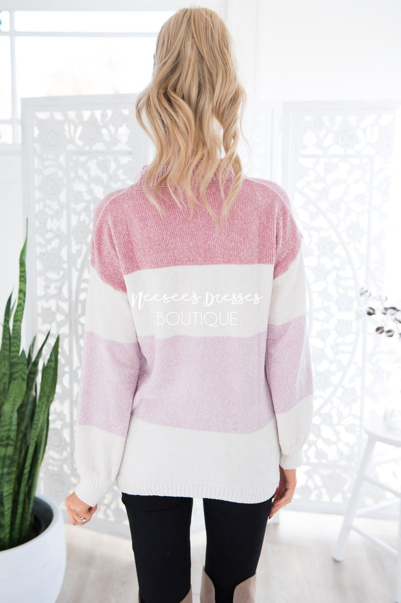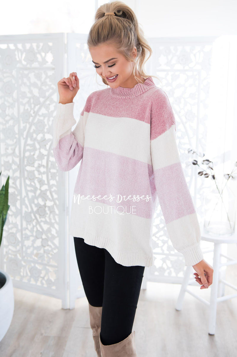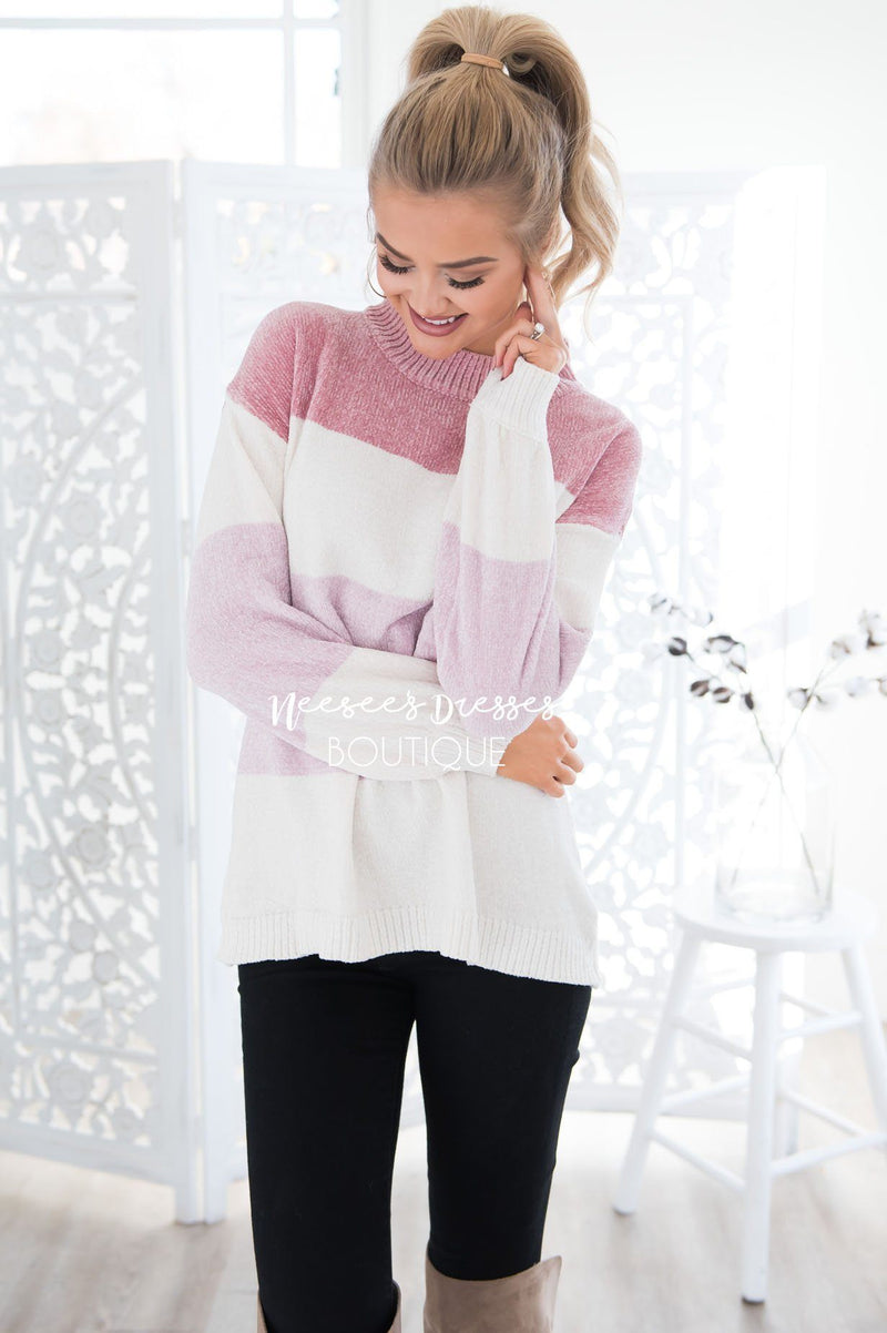 Ready for more cozy sweaters? Don't worry this chenille blush color block sweater will keep you nice and cozy on chilly days! This sweater is so modest, soft and feminine. The absolute perfect piece, it is so versatile and will look stunning dressed up or down!