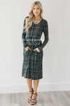 The Nellie is the perfect everyday dress! Cozy, warm and soft, this charcoal plaid dress features long sleeves, elastic waist, and side seam pockets.