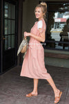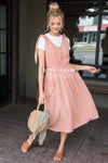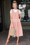 Overall dresses are one of our favorite things they are so classy and cute! We are living for the gorgeous button down detail on the bodice. The stripes are so simple and pair so well with the salmon color making for a classic look. This dress features adjustable straps, elastic waistband and gorgeous front pockets! You are going to want to keep grabbing for this dress. Also perfect for nursing mommas!