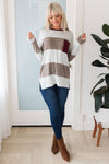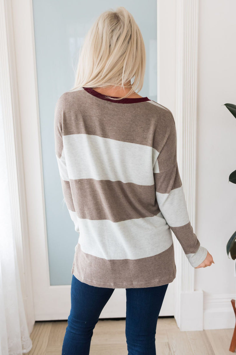This delicate striped sweater blouse is perfect in every way! We love the long sleeves, beautiful mocha and ivory stripes, and the contrasting maroon colored collar and front pocket! Did we mention how soft this fabric is? The oversized hi-low fit of this blouse makes it perfect for tucking into a skirt or jeans! This will be your new favorite blouse this season!