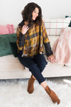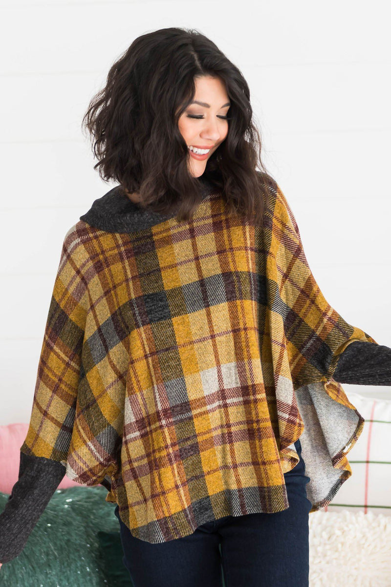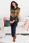 Ready for your new favorite fall top!? This gorgeous plaid dolman sleeve tunic top has a unique button detail neckline, a charcoal grey and mustard plaid color scheme and black long sleeves! The Cozy In is the perfect addition to your winter wardrobe!