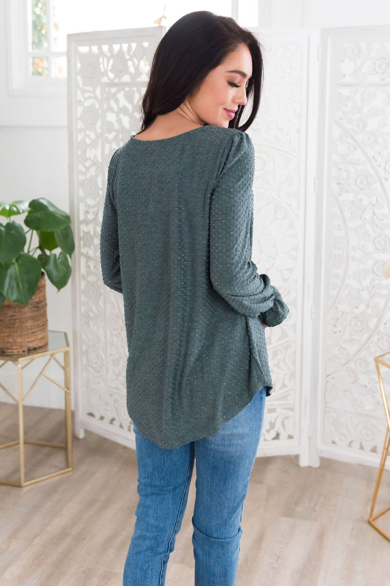 The Dare To Be You Modest Top is bound to make every outfit you pair it with pop! We are loving the swiss dot detailing throughout, cozy soft feel and perfect length sleeves with darling ruffle cuffs. Get yours today!
