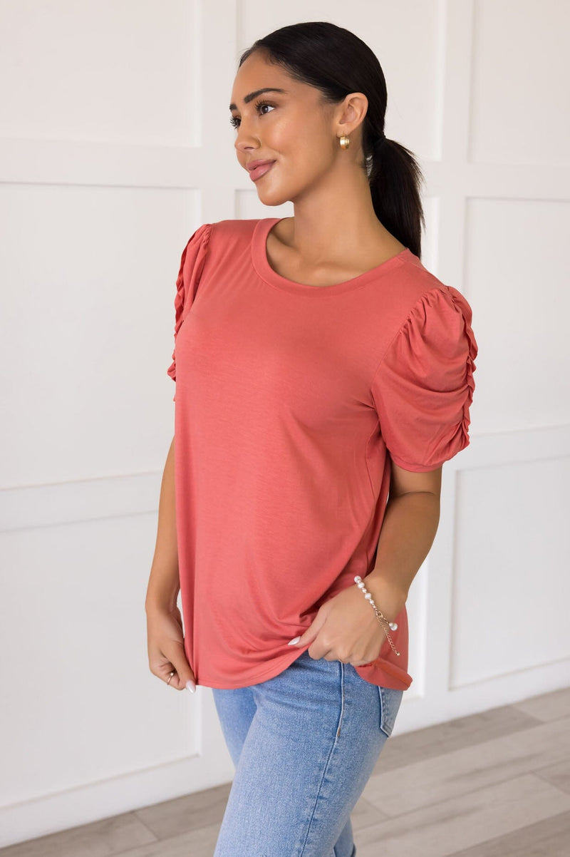 This delicate puff sleeve blouse checks all the marks! We love the mini ruffle sleeves, beautiful dusty marsala color, and the rounded neckline is absolutely radiant! The straight fit of this blouse makes it perfect for tucking in a skirt or leaving tucked out for jeans! This will be your new favorite blouse this season!
