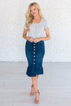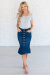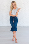 We are obsessed with this adorable new denim skirt! The Dark wash of this skirt is so universal you can style it endless ways. The cute ruffle hem adds the perfect amount of flair to any outfit! Jean skirt features button front detailing, side pockets and a ruffle hem bottom. Made in the U.S.A