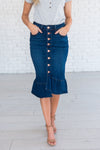 Dark Wash Denim Ruffle Hem Pencil Skirt