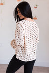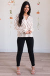 We love our new Date Day Top! It is so classy yet playful, we have never seen such a beauty! It features a gorgeous cream color with chocolate polka dots, long sleeves, and a modest v-neckline! This blouse is sure to sell out, so hurry and gets yours today!
