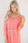 Meet your new favorite dress and our best ever selling dress! Do not wait to order yours, this dress will sell out instantly! Our Day Dreamer dress is fully lined, has 3/4 length sleeves, a relaxed fit and the overlay is this beautiful coral crochet lace.