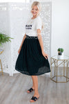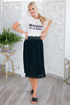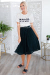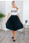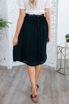 This dazzling crepe skirt is such a fun addition to your closet! The perfect shade of dark green paired with the contrasting pumpkin dot print is absolutely stunning! Featuring an elastic fitted ruffles waist band and is completely lined.