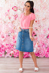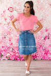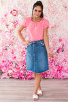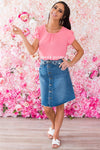 Add the perfect touch to your wardrobe with this new denim skirt! This will be your new signature piece, a cutoff blue denim skirt is such a chic way to add a little flair to any occasion! Features fitted waist with functional button front, pockets and perfect modest length!