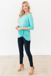 Talk about style! This darling new aqua arrival is so flowy, fun and stylish! Featuring a modest round neckline, long sleeves, the softest material ever, and twist tied hem! Get yours today!