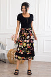 This gorgeous skirt is simply perfection! Perfect for any event and any body shape! This darling ruffled floral has stolen our hearts! Features side seam zipper closure, belt tie waistline and the most darling triple ruffled hemline. Get yours before they are gone!