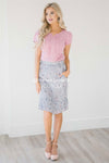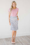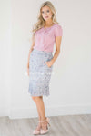 Don't blink or this skirt will be gone! It's too cute for words! Dusty lilac pencil fit skirt features a small pink and dark purple floral print and an adorable pleated hem detail. Skirt is fully lined, has a back elastic waist and side zipper closure.