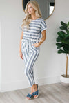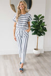 Adorable dusty navy and white jumpsuit with contrasting horizontal and vertical stripes, front pockets and short sleeves!