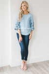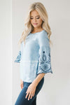 This top has the softest material and cutest feminine touches! The light chambray color makes this top have the perfect spring feel to it! This top features navy embroidery on the bell sleeves, a scoop neck line, and a back keyhole closure!