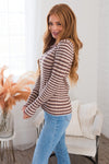 We simply can not stop obsessing over how adorable our new Falling For You top is! We adore the taupe, ivory and chocolate striped fabric, long sleeves, and collared neckline! Make sure you pick one up fast, these beauties wont last!