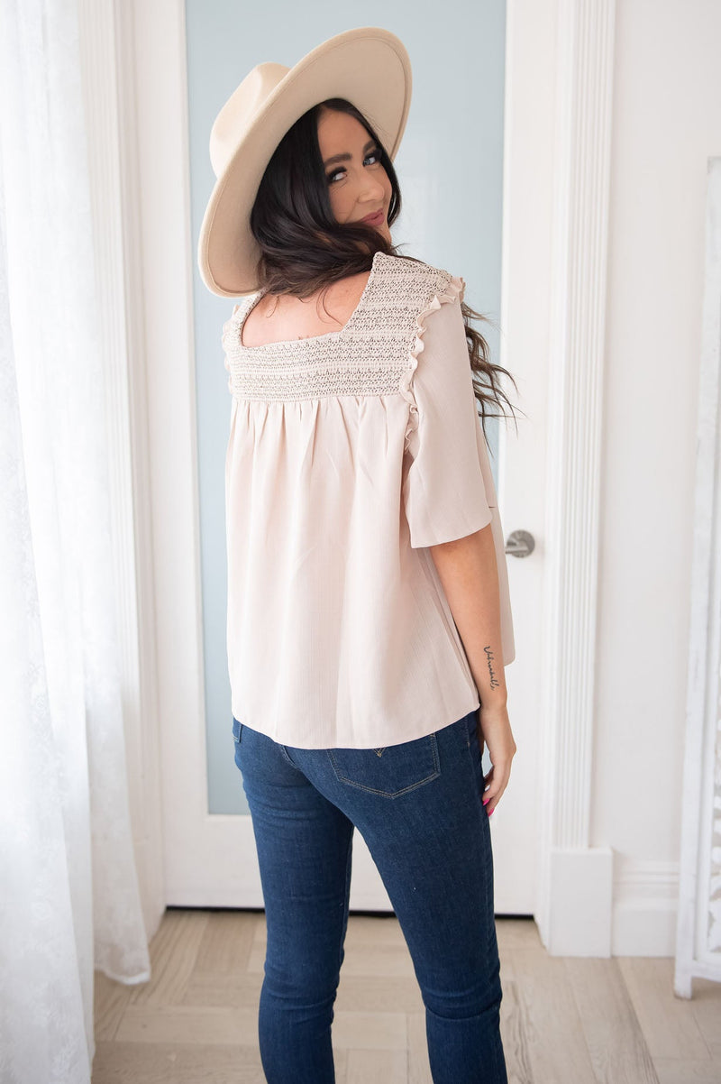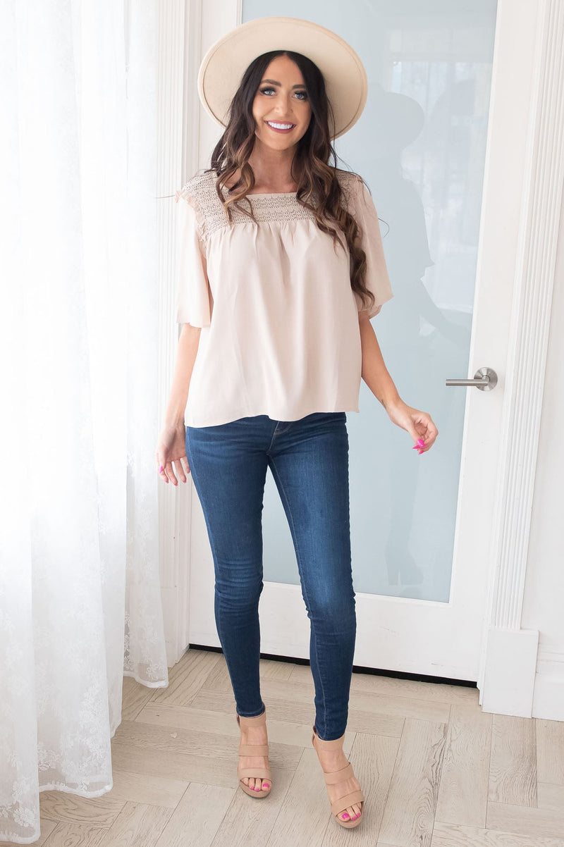 Say hello to this new cutie! This blouse will give you all the feels! You'll feel absolutely trendy, comfortable, stylish & modest, when you slip into this one! Featuring half flutter sleeves and a classy smocked neckline! You do not want to let this one pass you by! Get yours today.