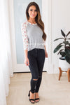 Grab this fun super soft stretchy floral top and say hello to comfort & style! This heather grey floral top features, an adorable baseball tee style, long cream floral sleeves, a rounded neckline, and a super soft stretch fit. Perfect for pairing with skirts or with jeans.