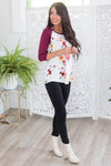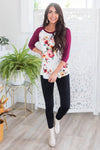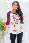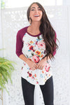 Grab this fun super soft stretchy floral top and say hello to comfort & style! This cream floral top features, an adorable baseball tee style, long burgundy sleeves, a rounded neckline, and a super soft stretch fit. Perfect for pairing with skirts or with jeans.
