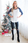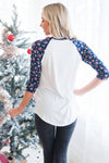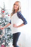 Grab this fun super soft stretchy floral top and say hello to comfort & style! This ivory top features, an adorable baseball tee style, long navy floral sleeves, a rounded neckline, and a super soft stretch fit. Perfect for pairing with skirts or with jeans.