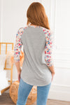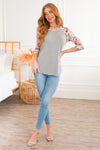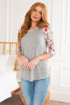 Grab this fun super soft stretchy floral top and say hello to comfort & style! This light grey top features, an adorable baseball tee style, long light taupe floral sleeves, a rounded neckline, and a super soft stretch fit. Perfect for pairing with skirts or with jeans.